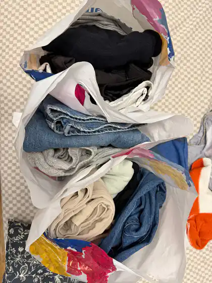 Отдам три пакета женских вещей 36-38 размер. Джинсы кюлоты толстовки. Все в хорошем состоянии (без дырок и катышек) Забирать недалеко от парка 6 мая Бронь