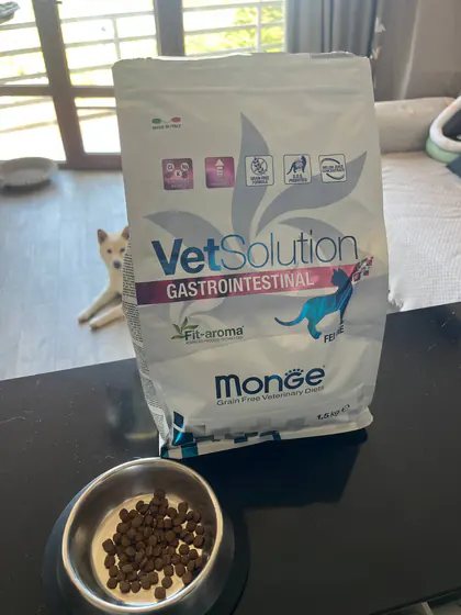Корм Monge Gastro. Нашей привередливой кошке не зашел. На фото видно сколько использовали. Сразу герметично запечатала. Брала за 70 лари, отдам за 40