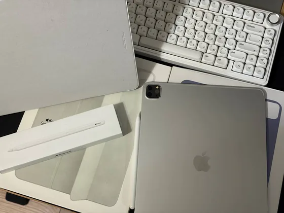 iPad Pro 12.9 M2 128gb В комплекте: 1. Коробки и чеки от всех комплектующих. 2. Зарядка на 20 ватт и провод. Провод нужно будет поменять, он контакт теряет, но на первое время норм. 3. 3 чехла Smart Folio, один почти новый. 4. Apple Pencil 2 Цена: 2000 лари, состояние 9,5/10, батареи хватает на весь день просмотра контента.