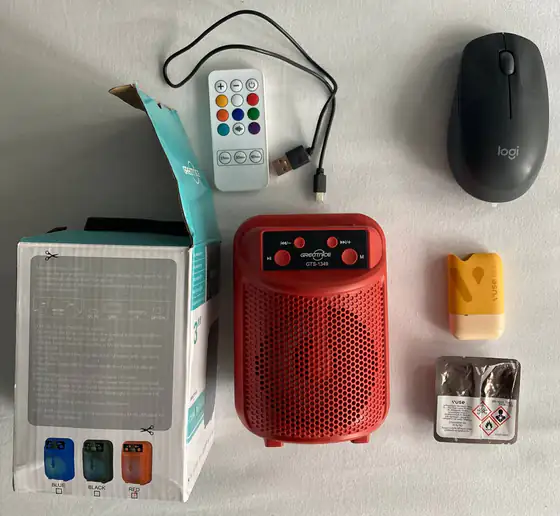 Колонка новая, в коробке Не из маленьких! Воспроизведение с флешки usb, карты microsd, через bluetooth, и радио Включалась только для проверки Вполне хороший звук, 30 лари Беспроводная мышь Logitech Под (вейп) Vuse go, в комплекте с новым картриджем Strawberry ice 20 лари