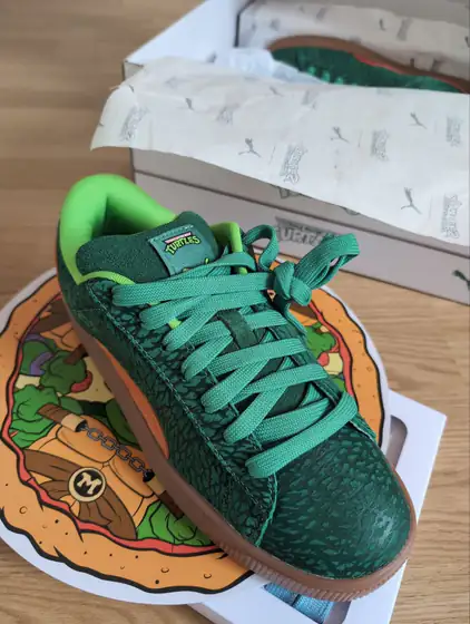 Продаю кроссовки Puma Suede XL —Teenage Mutant Ninja Turtles (TMNT) Лимитированная коллаборация (ограниченный выпуск), не купить в Грузии Комплект: как на фото, 4 пары шнурков, 7 значков, подложка под пиццу) Размер: указан на коробке, 27 см Состояние: новые Качественные материалы(замша, кожа), текстурированное исполнение Цена 400 лар Обращайтесь)
