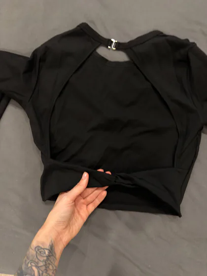 Спортивный топ укороченный. Спина открытая. Новый! Не носился! Размер М но по факту S Ткань плохо тянется, у меня не влезли руки. На девушку со стройными руками будет идеально. Вырез на спине очень красивый. 15 лари.