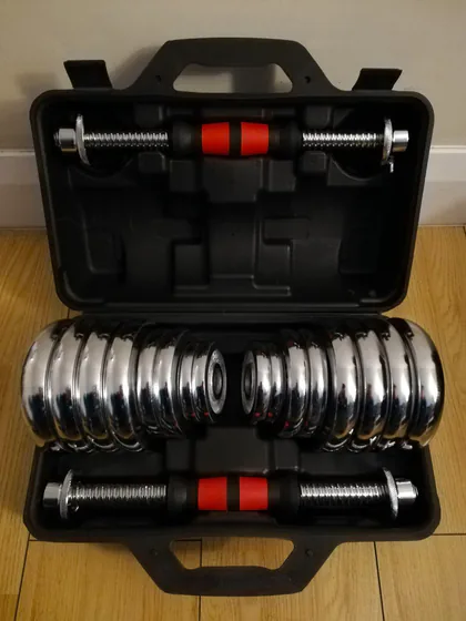 Набор гантелей 30 кг в кейсе, 360 лари. В комплекте: Два грифа для гантелей, 8 блинов по 2,5 кг, 4 блина по 1,25 кг, 4 блина по 0,5 кг, а так же 4 гайки-фиксатора. Можно собрать две гантели до 15 кг.