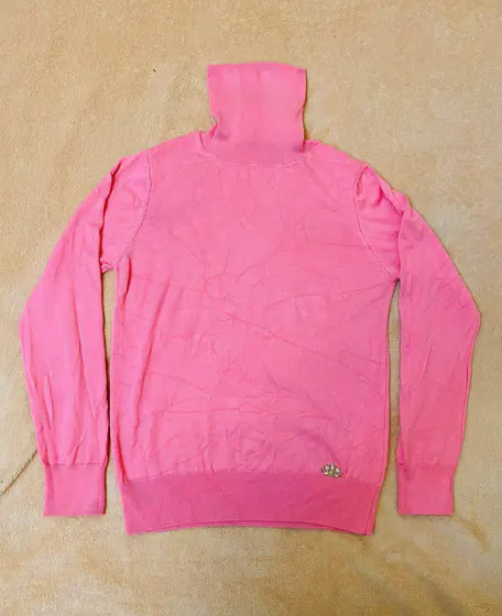 Розовая водолазка Kazee, женский свитер. Цвет очень яркий, качество отличное. С золотистой короной из металла. Размер S-M. Цена 25 лари.