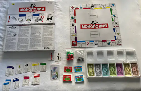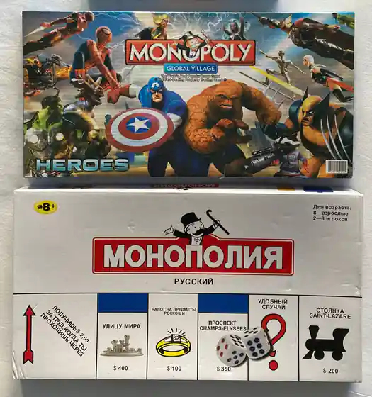 Монополия Классическая популярная игра (8+) Большие коробки : • верхняя - на англ. , специальное издание ‘Супергерои’, никаких сложностей не возникает - всё интуитивно понятно (75 ₾) • нижняя - русифицирована (85 ₾) Полный комплект Настольная игра | настолка