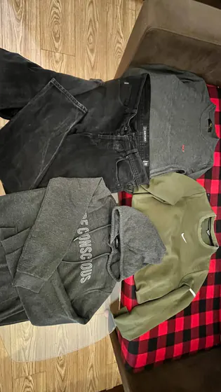 Отдам мужские вещи (может кому нужны в горах или на рыбалку)) кофты размер s , джинсы size 30
