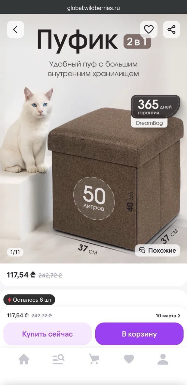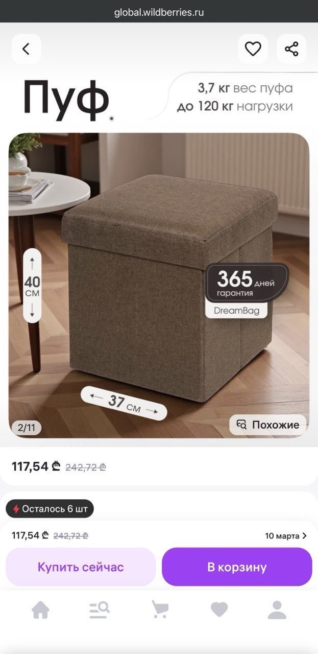 Пуфик/пуф с местом для хранения 38х38 см. Объем: 40л 30 лари В очень хорошем состоянии. Использовался в течении 2х месяцев Без царапин, пятен, повреждений Выдерживает до 100 кг веса