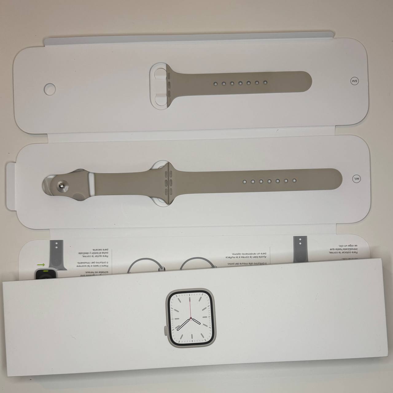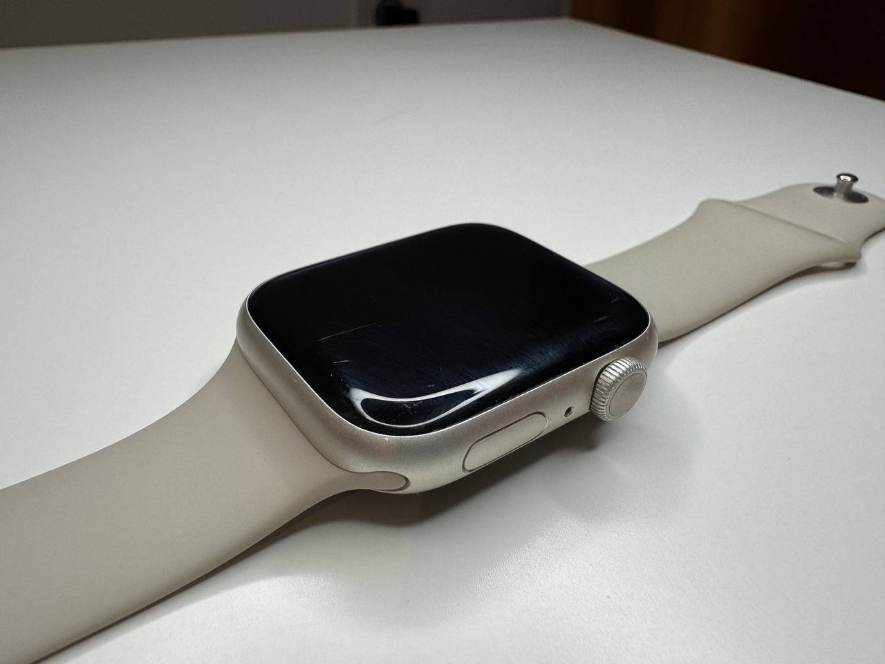 Продаю Apple Watch Series 7 45mm Starlight (7 поколение) Полный комплект: коробка, часы, ремешок, кабель зарядки. Часы в хорошем состоянии. На часах есть царапины на стекле (смотрите фото), но на работу часов не влияет. Оригинальный ремешок в отличном состоянии, его почти не носил. Цена: 400 лари